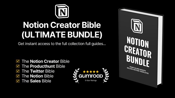 Notion Creator Bible is a detailed step-by-step guide breaking down and covering all the steps it takes to go from never having used Notion before, to running a 6-figure digital product business selling Notion templates on autopilot.